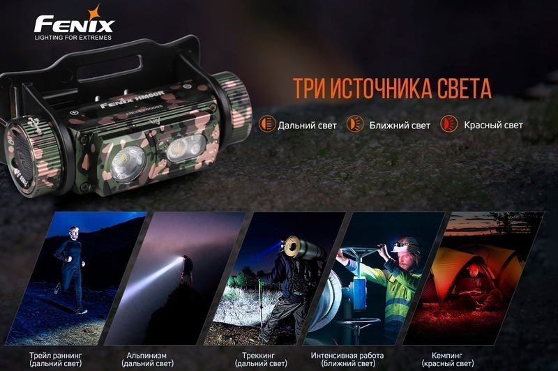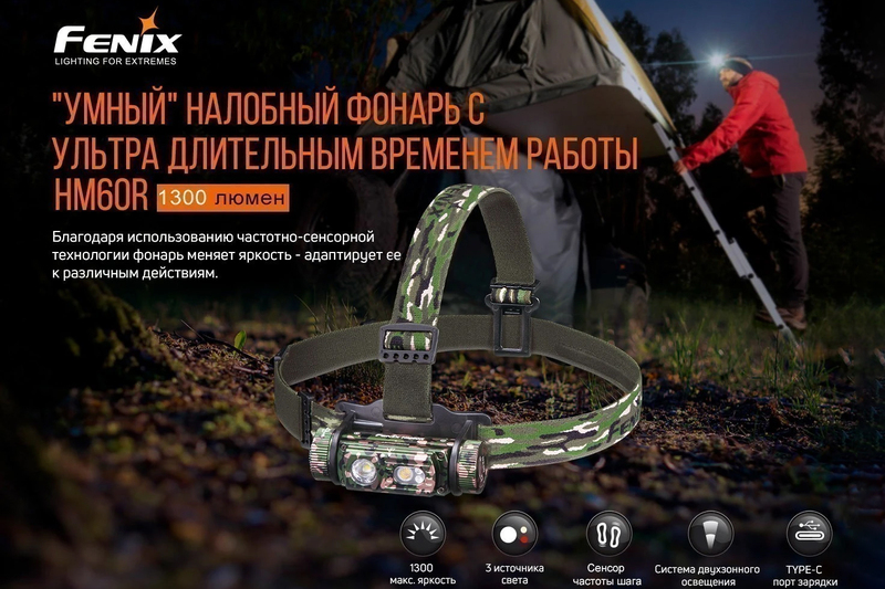 Дальний свет, ближний свет и красный свет комбинируются. Компания Fenix заботится о том, чтобы делать как можно более продвинутые модели, поэтому регулярно улучшает их и выпускает усовершенствованные фонари. Новшеством в этом налобнике является сенсор частоты шага: яркость меняется вместе со скоростью движения. Налобная модель Fenix HM60R создана для максимального комфорта пользователя.