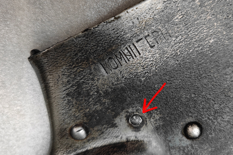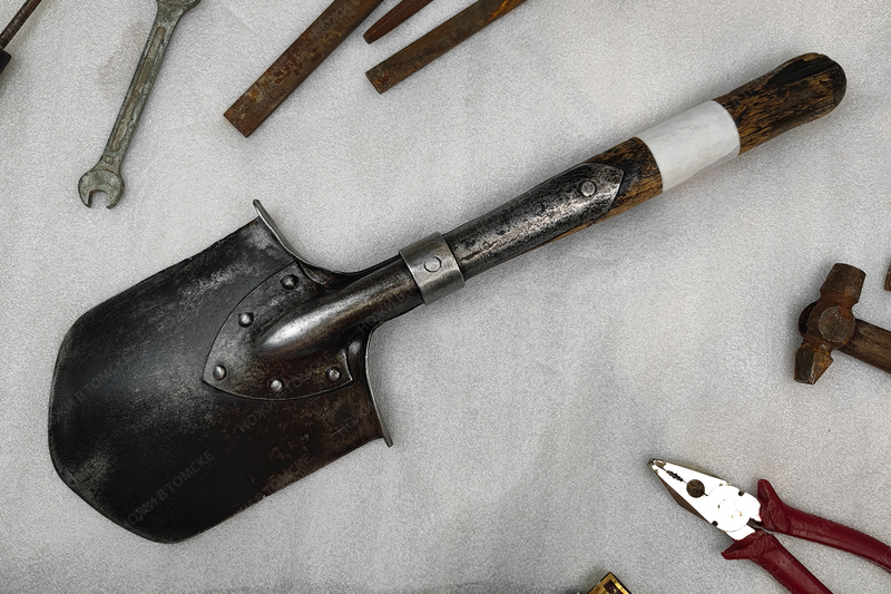 Клепаная лопатка 1917 года, Златоуст. На штыке год выпуска, клеймо военной приемки и клеймо завода. Ручка была частично прогоревшей, я этот момент творчески отреставрировал с помощью УФ смолы.