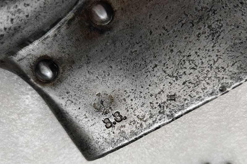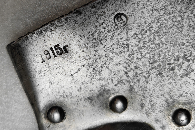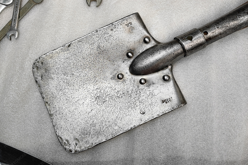 Клепаная лопатка 1915 года, Златоуст. На штыке год выпуска, клеймо военной приемки и клеймо завода. Редкая квадратная форма для 1915 года. Нет головы на одной из клепок.