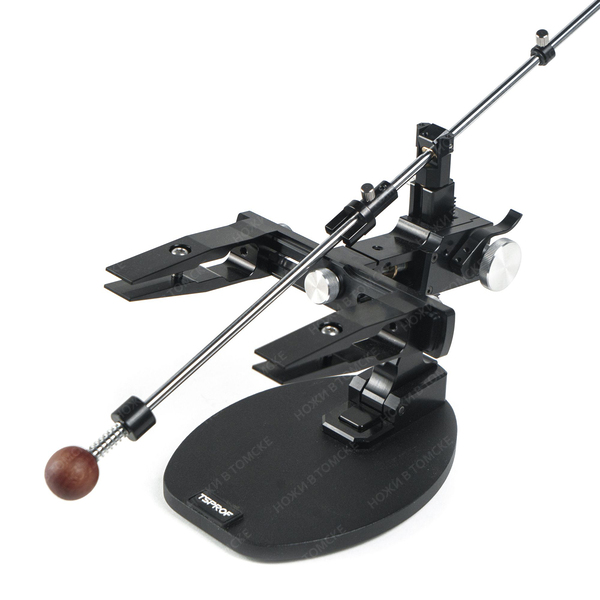 Поворотный механизм точилки TSPROF Kadet Pro GE помогает сохранить одинаковый угол заточки на обеих сторонах ножа. Допустимая погрешность при перевороте рамки составляет 0,4°. После переворота рычаг намертво фиксирует рамку с зажимами. Вращением ручки подъема, поворотный узел плавно движется вокруг виртуального центра, в котором находится режущая кромка ножа. Дуговая стойка изготовлена из единого куска алюминия и интегрирована с реечным подъемником с зубчатым зацеплением. Стопорный рычаг, после настройки необходимого угла, позволяет надежно зафиксировать крепление поворотного узла. В комплекте уже установлен модифицированный шарнирный узел Glide, который обеспечивает более плавный ход штанги без заеданий и трения.