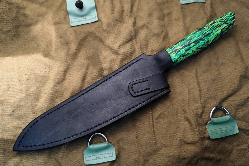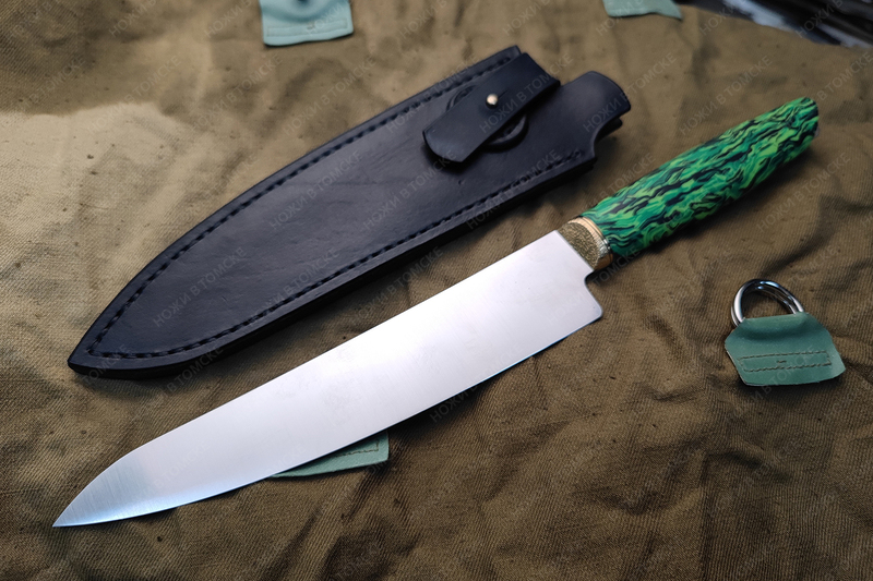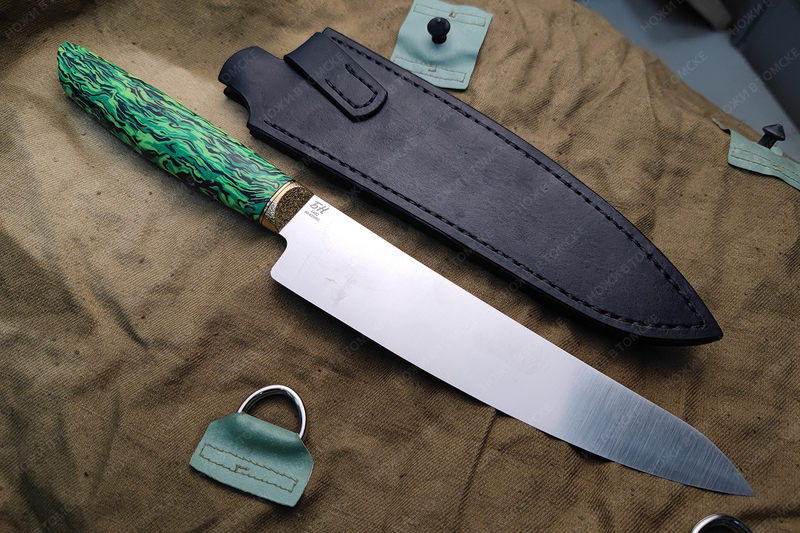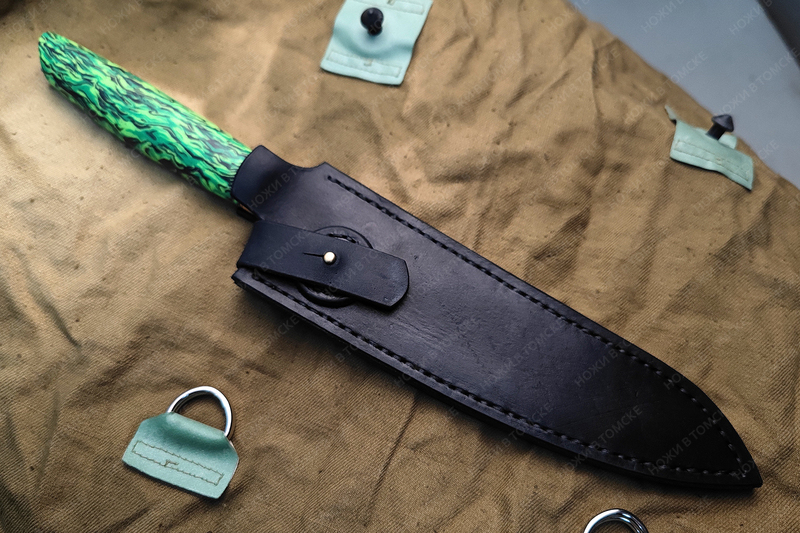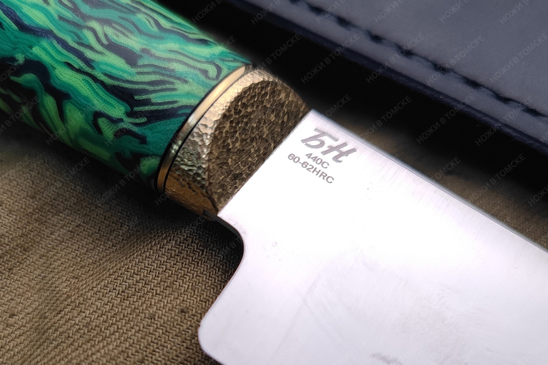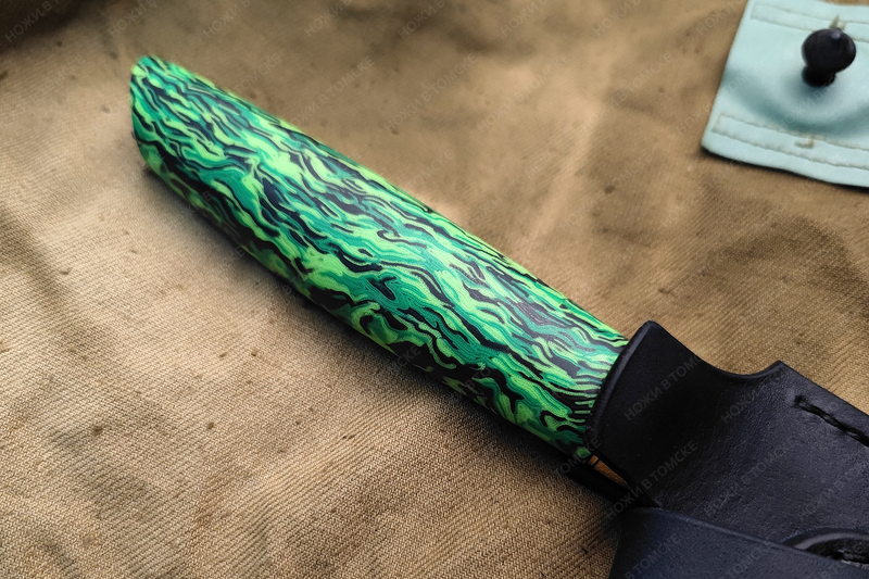 Рукоять выполнена из микарты от местного производителя, длина рукояти 128 мм, больстер латунь.