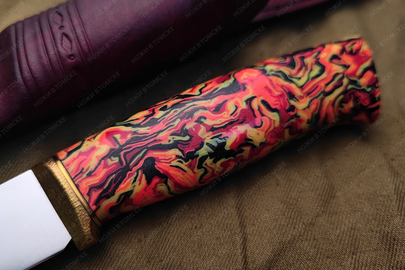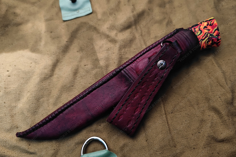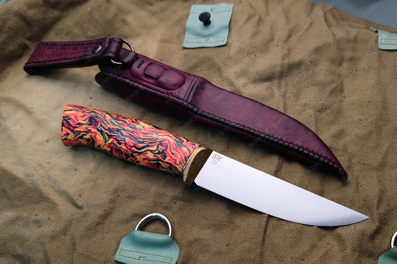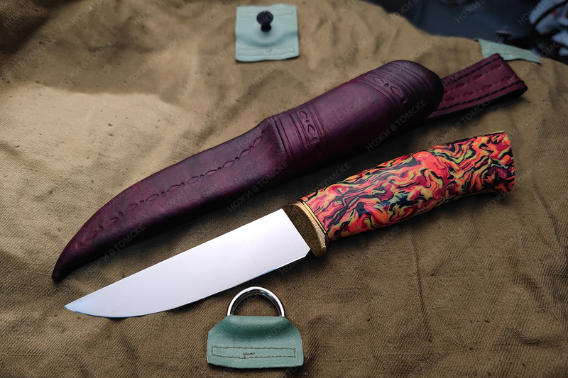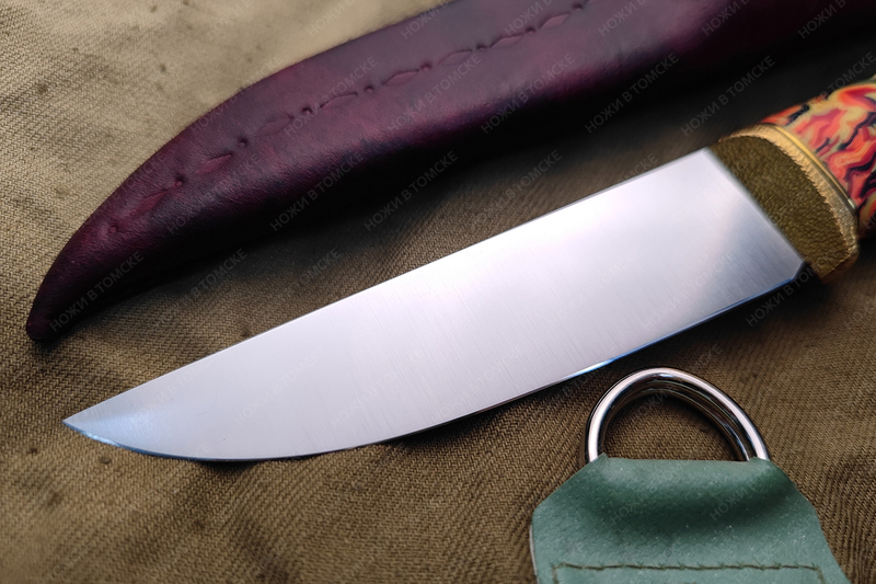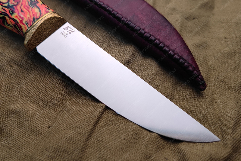Работяга с следующими характеристиками: клинок из полосы N690, Т.О. Бондаренко, твердость 61 ед., длина клинка 111 мм, толщина клинка у больстера 2,4 мм, к острию на слабый клин, ширина клинка у больстера 28 мм., спуски от обуха слабой линзой до 0,1 мм., финиш клинка поперечный сатин, клинок заточен до бритвенной остроты на общий угол 37 градусов. Рукоять выполнена из микарты томского производства, больстер латунь, монтаж всадной, длина рукояти 128 мм. Ножны из кожи растительного дубления толщиной 2,9 мм, стандартное тиснение, окрашены и обработаны, подвес свободный.