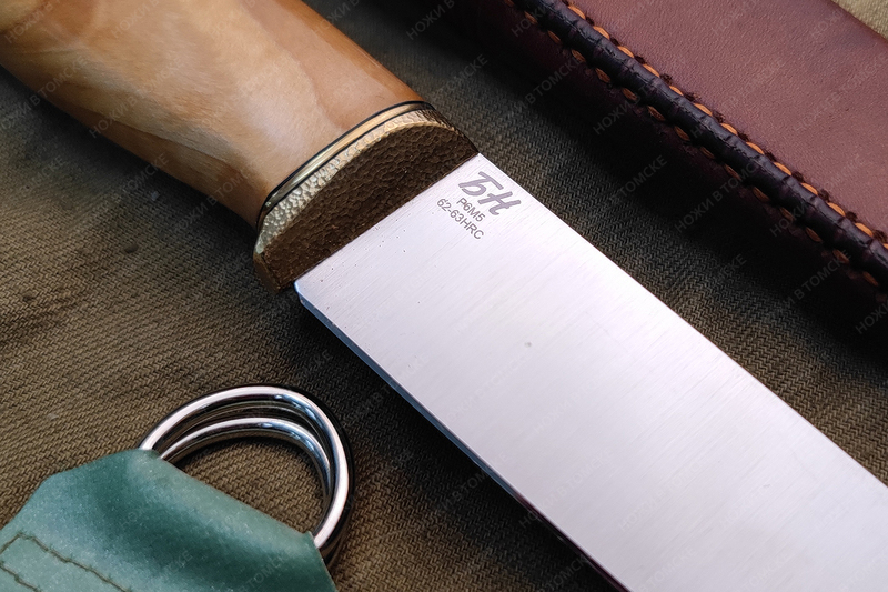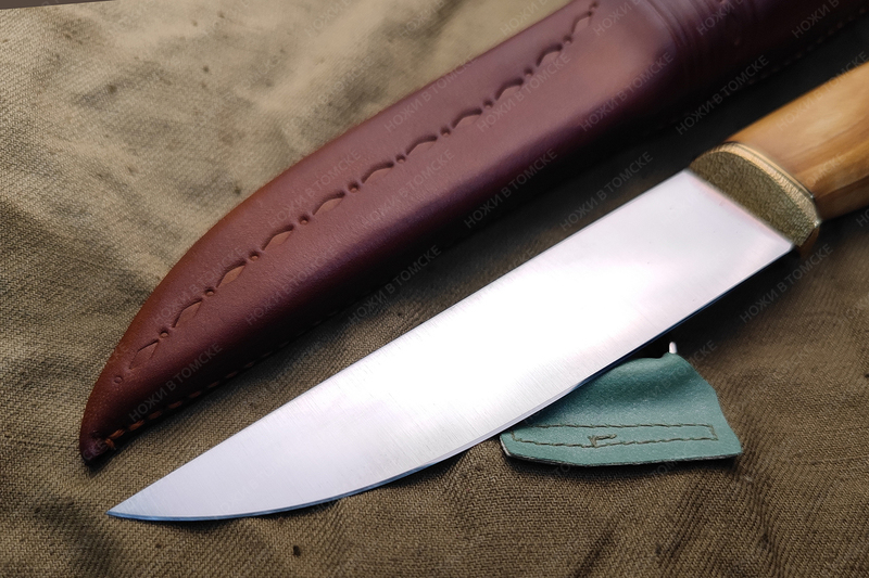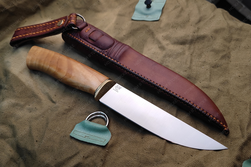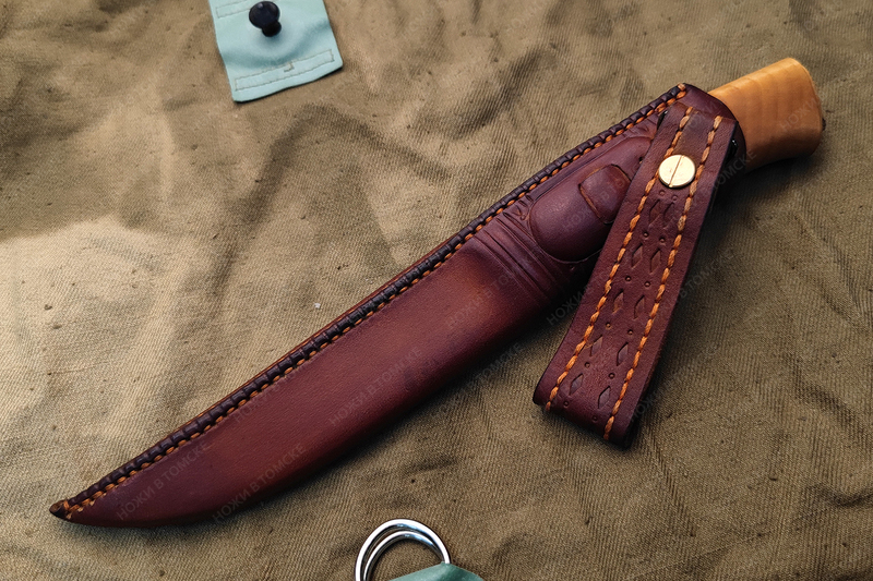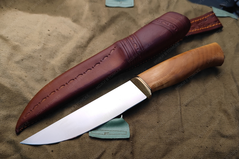 Рукоять выполнена из карельской березы, больстер латунь (дятлинг), длина рукояти 127 мм, рукоять пропитана смесью масел, монтаж всадной.