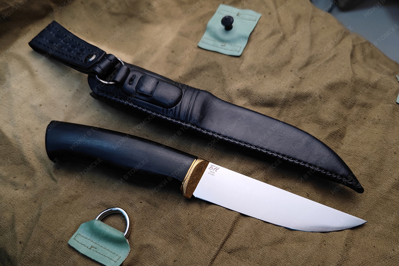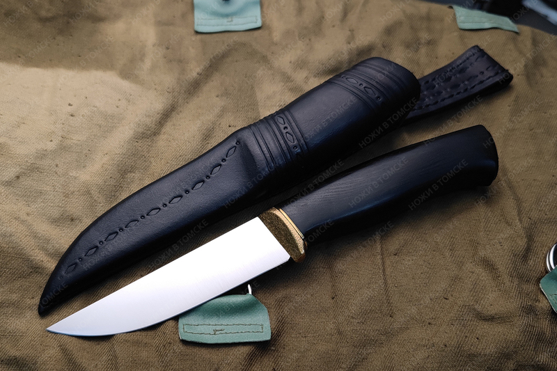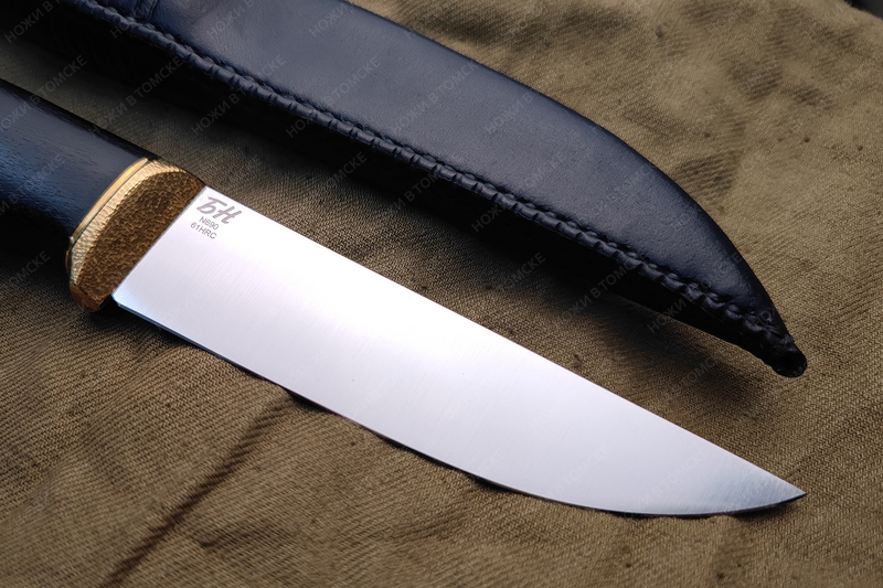 Лаконичный в темных тонах, с следующими характеристиками: Клинок из полосы N690, Т.О. Бондаренко, твердость 61 ед., длина клинка 112 мм, толщина клинка у больстера 2,5 мм, к острию на слабый клин, ширина клинка у больстера 28 мм., спуски от обуха слабой линзой до 0,1 мм., финиш клинка поперечный сатин, клинок заточен до бритвенной остроты на общий угол 37 градусов,.