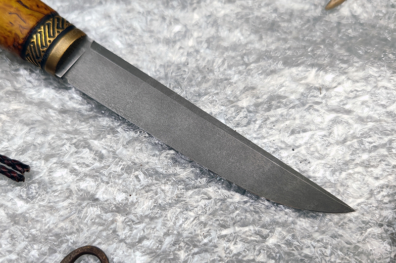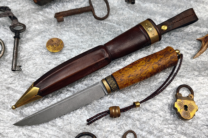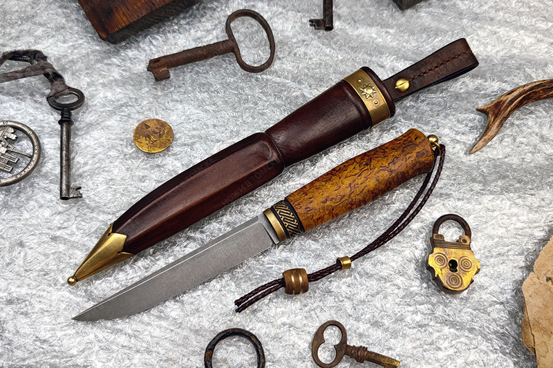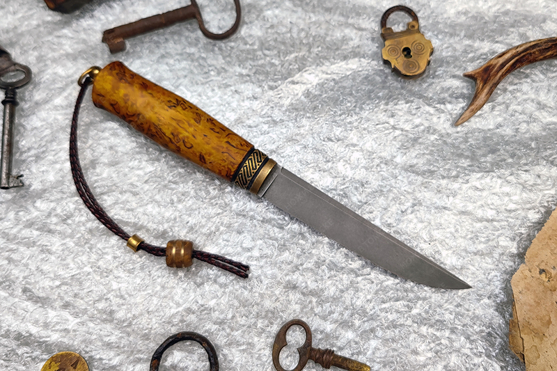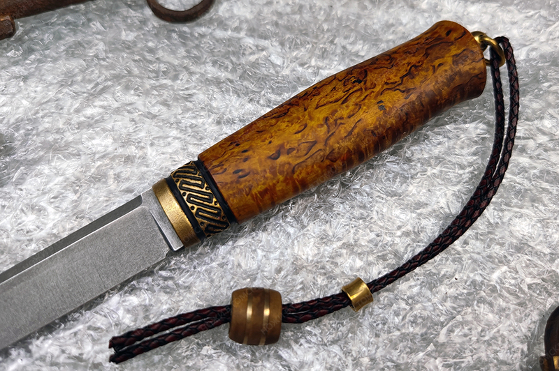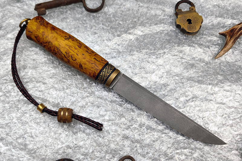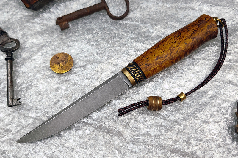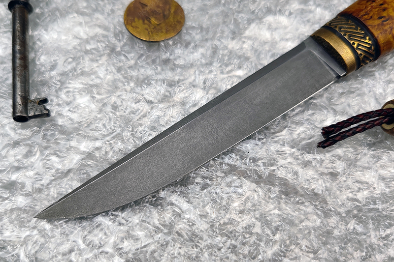 Рукоять выполнена из карельской березы, больстер латунь (дятлинг), длина рукояти 127 мм, рукоять пропитана смесью масел, монтаж всадной.