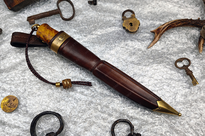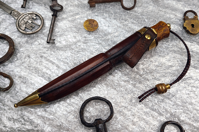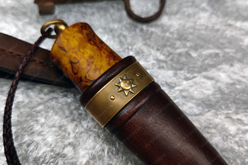 Мастерская Нарэ. Юрий Томилов. D2, стаб. карельская берёза, латунь, кожа растительного дубления, вставка в ножнах - липа.