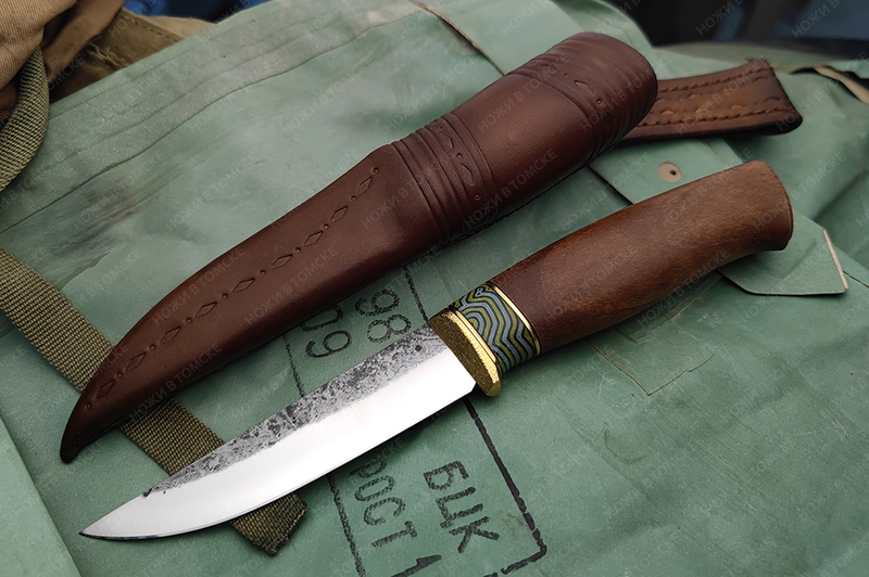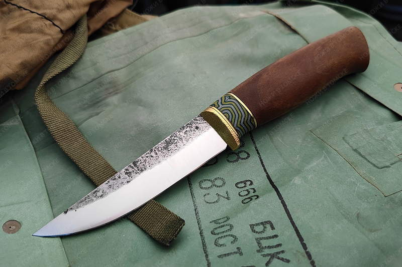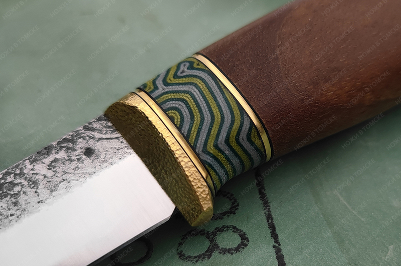 Рукоять выполнена из ореха, проставка микарта, больстер латунь, рукоять пропитана смесью масел. Длина рукояти 126 мм.