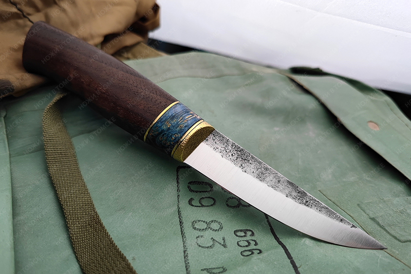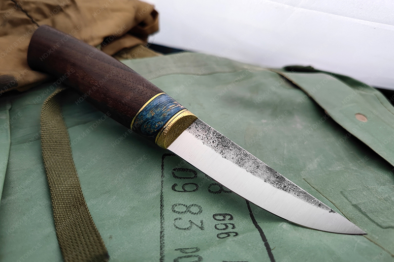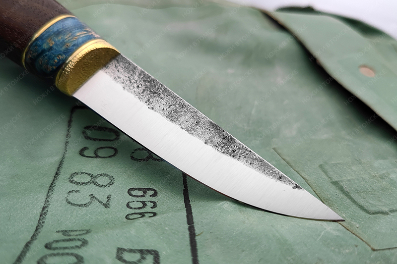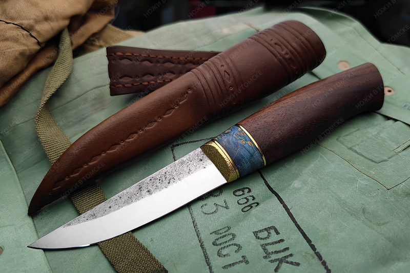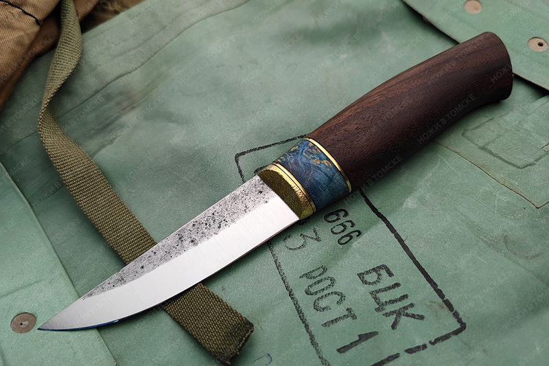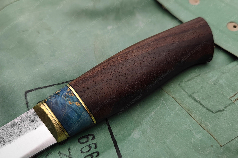 Рукоять выполнена из карельской березы, больстер латунь (дятлинг), длина рукояти 127 мм, рукоять пропитана смесью масел, монтаж всадной.