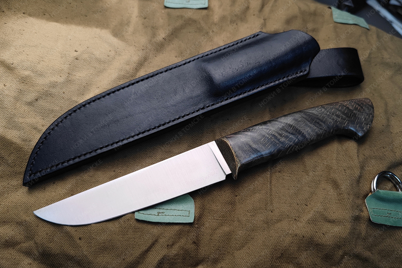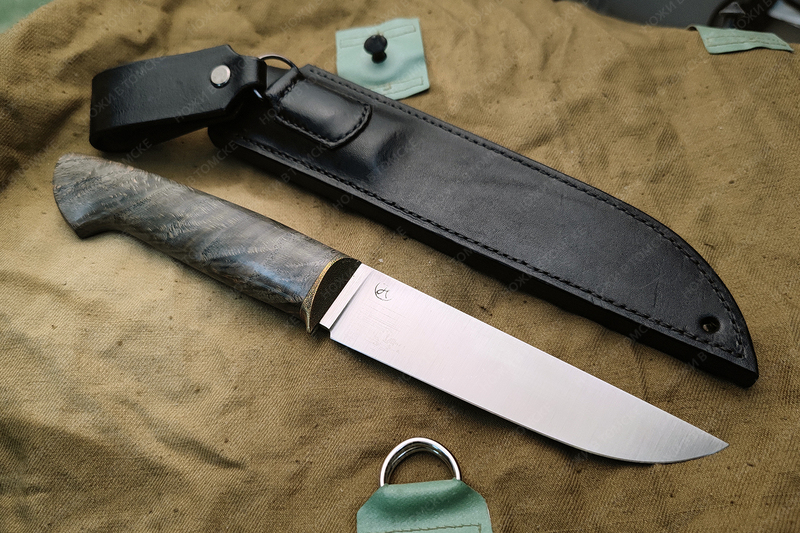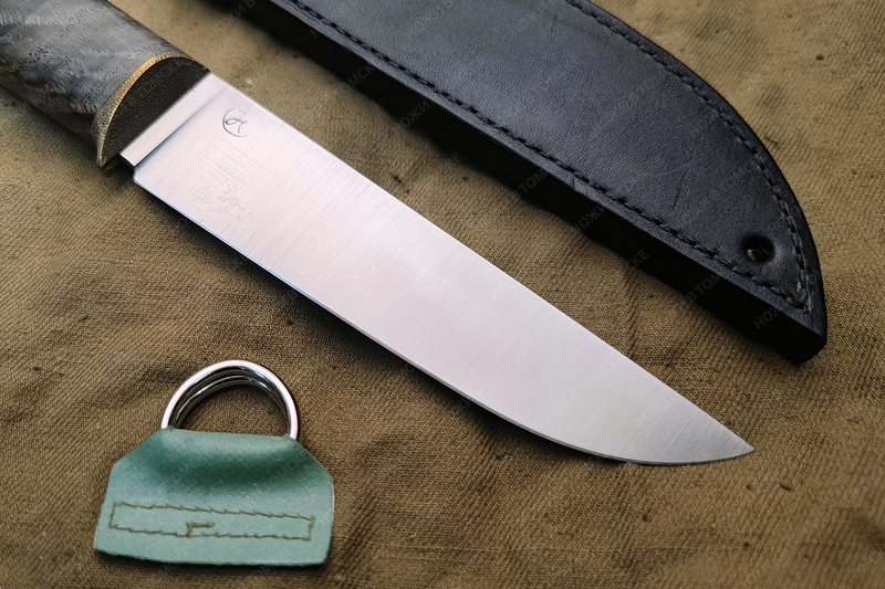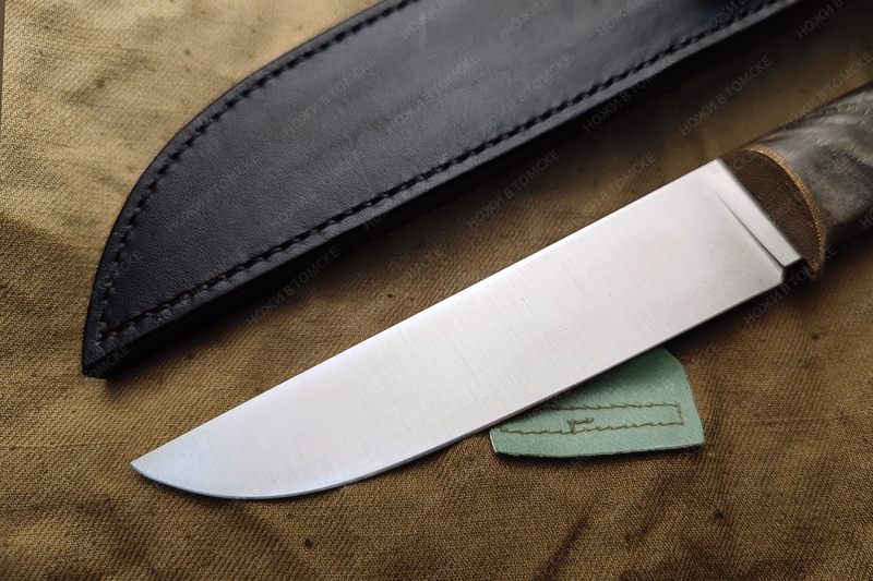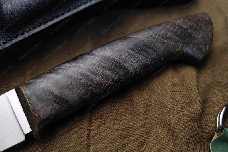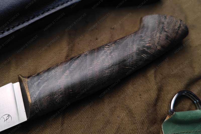 Рукоять выполнена из карельской березы, больстер латунь (дятлинг), длина рукояти 127 мм, рукоять пропитана смесью масел, монтаж всадной.