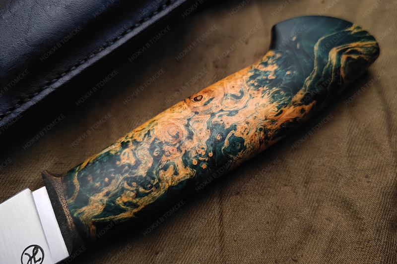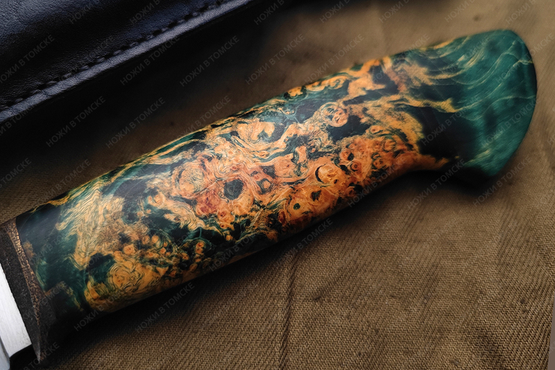 Рукоять выполнена из стабилизированного корня ореха, больстер латунь (дятлинг, патина), длина рукояти 130 мм, рукоять пропитана смесью масел, монтаж всадной.